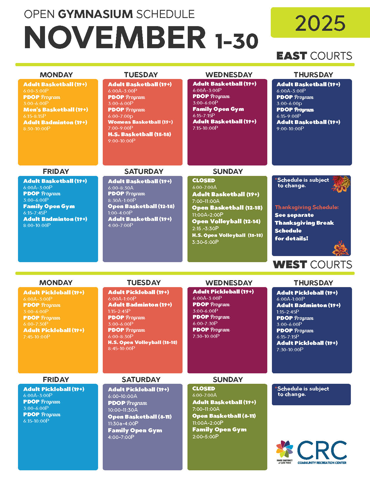 View any of the CRC Open Gym schedules below. Click on the image to enlarge. Open Gym available for youth ages 8-18 from 11:00A-6:00P on No School days.