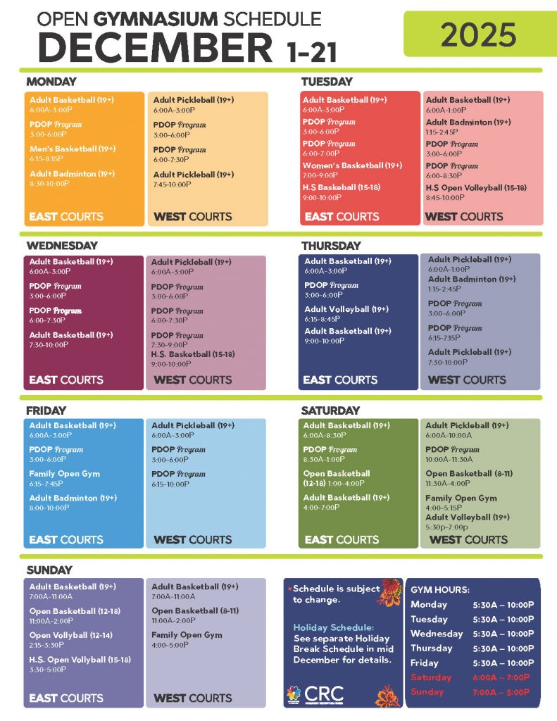 View any of the CRC Open Gym schedules below. Click on the image to enlarge. Open Gym available for youth ages 8-18 from 11:00A-6:00P on No School days.
